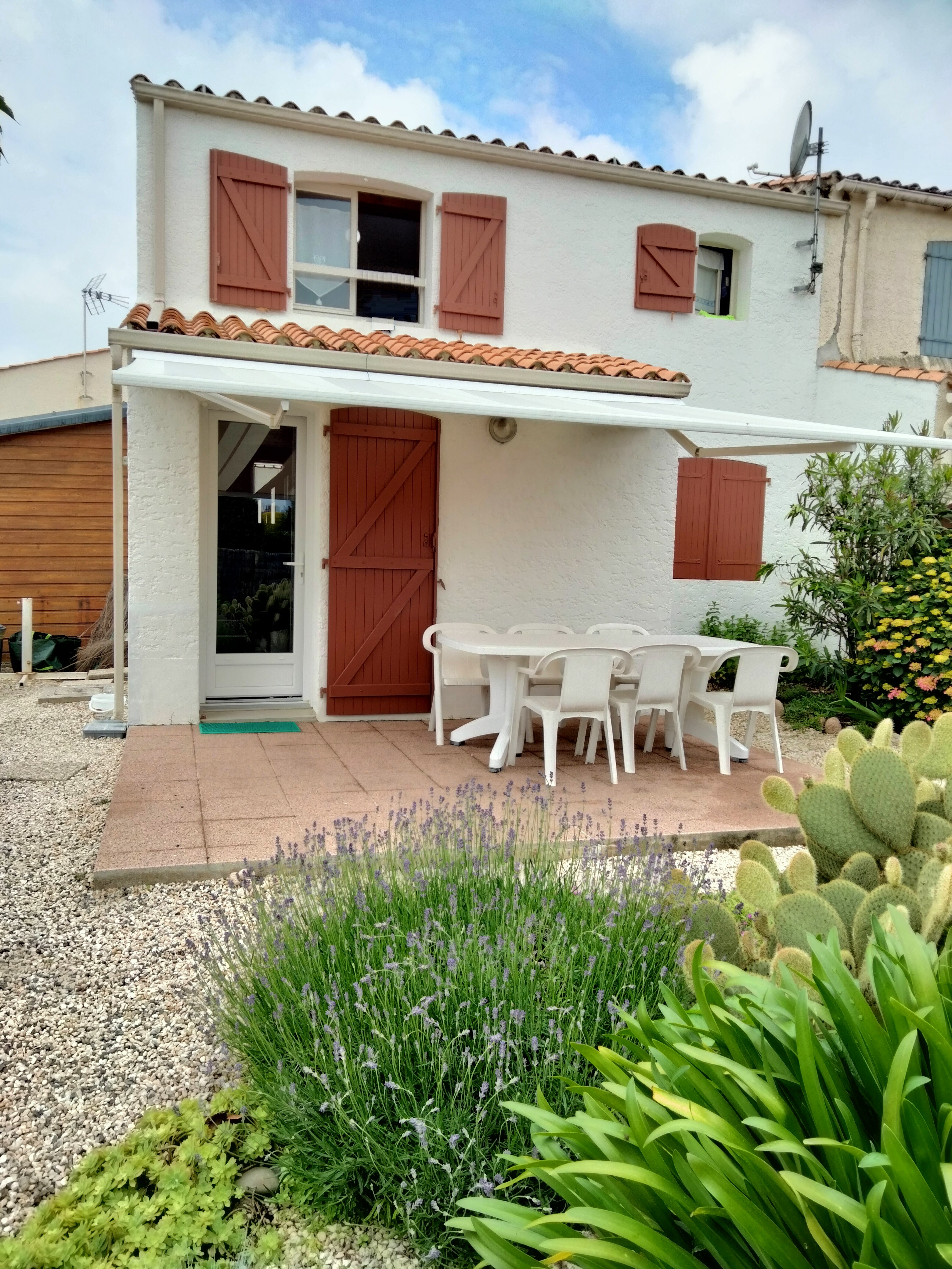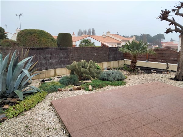 Quartier de la Marcellière - Au calme, 400 m du zoo, 1 km de la plage de Tanchet, 2 km de la grande plage des Sables d'Olonne - Agréable maison T3 + mezzanine d'environ 56 m² hab. avec joli jardin paysagé, comprenant au rez-de-chaussée : séjour-salon avec TV écran plat, une chambre avec lit 140, cuisine en contre bas aménagée et équipée (réfrigérateur, four, lave-vaisselle, micro-ondes, hotte, plaque induction 3 feux), débarras avec lave-linge, accès terrasse à l'arrière (store banne élec.) et jardin paysagé (salon de jardin + chaises longues) . à l'étage : mezzanine avec couchages (1 lit 140 + 1 lit 90), wc, salle de bains, une chambre avec lit 140 et armoire. Parking privatif. Capacité : 6 couchages. Animaux non admis. Non fumeur.