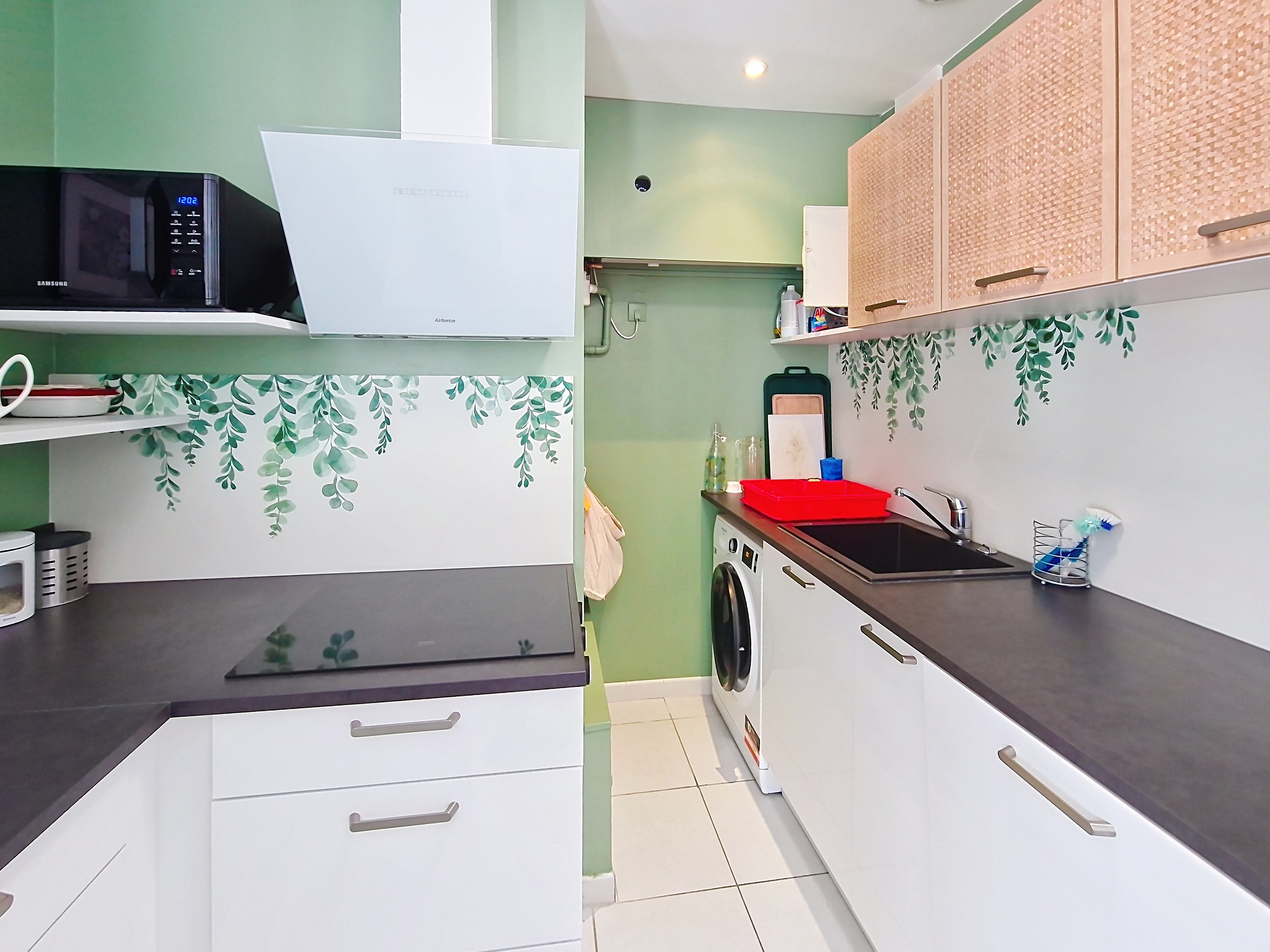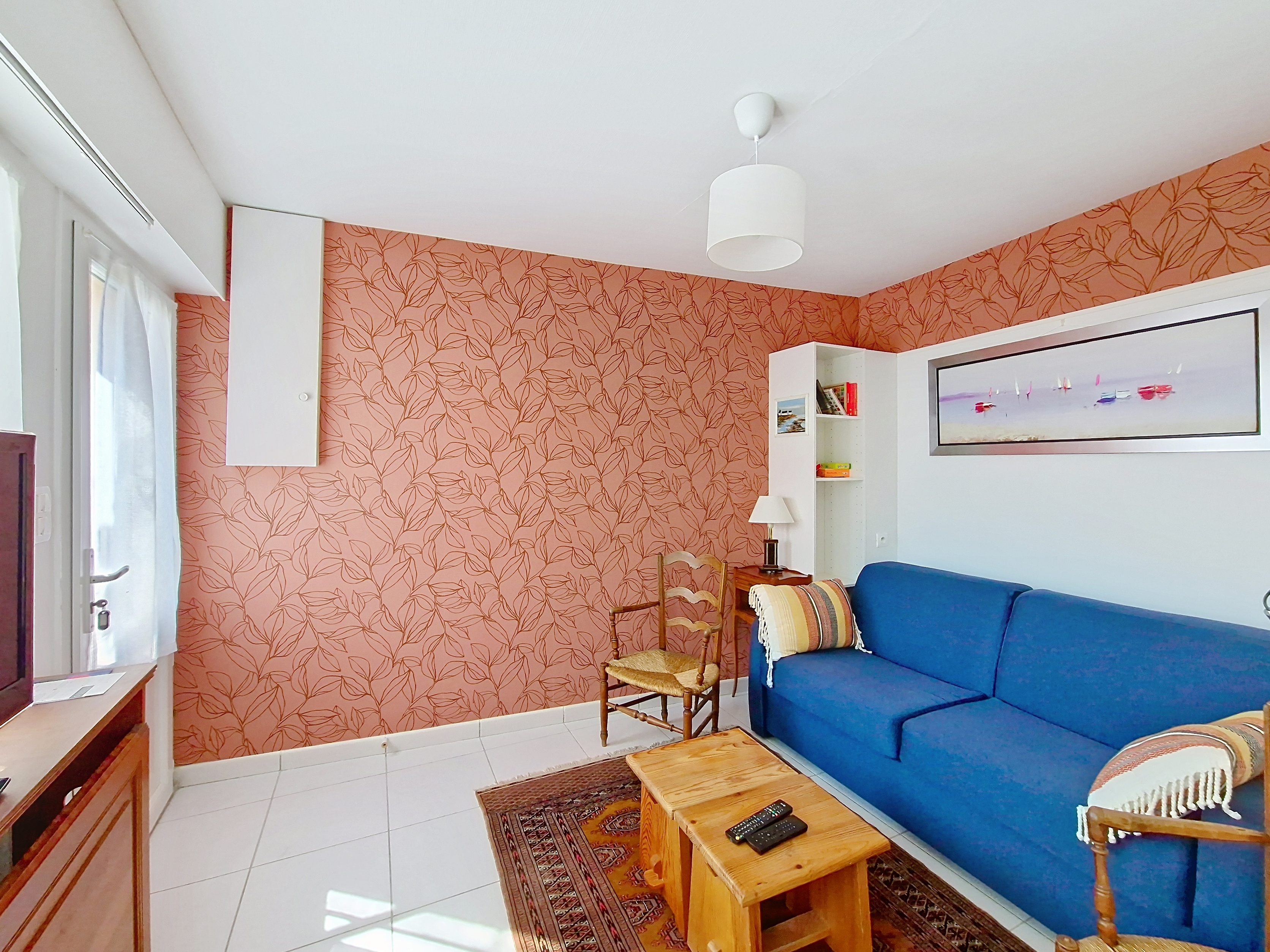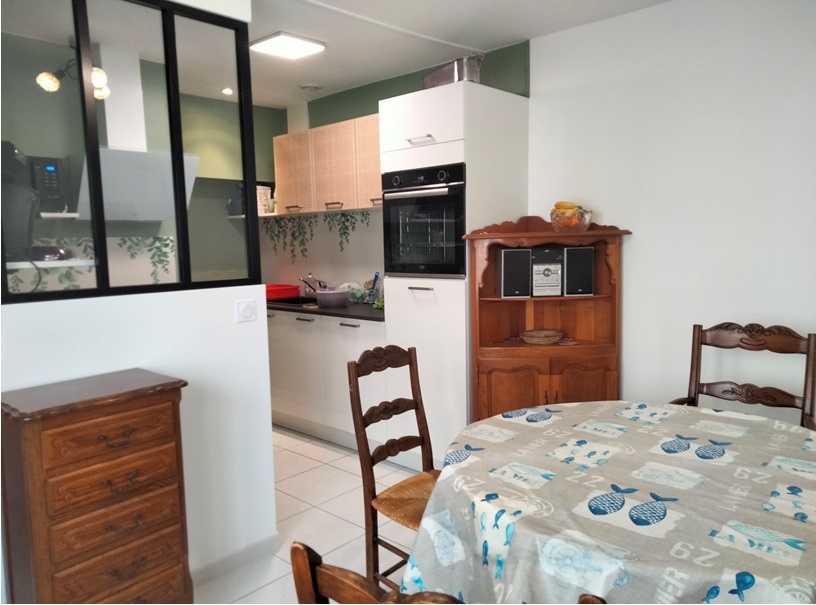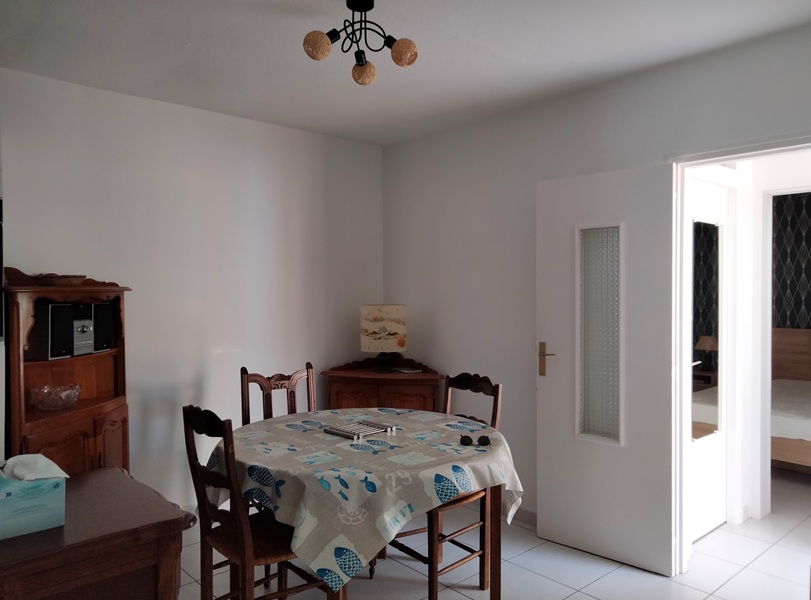 Entrée, salle-à-manger, cuisine aménagée et équipée ouverte sur séjour (four, hotte, réfrigérateur, plaque vitrocéramique, lave-vaisselle, lave-linge) - salon avec TV canapé-lit - chambre (lit 160 et placard-penderie) - wc - salle d'eau - cour - La plage, la ville, le marché, tout à pied ! Wifi inclus