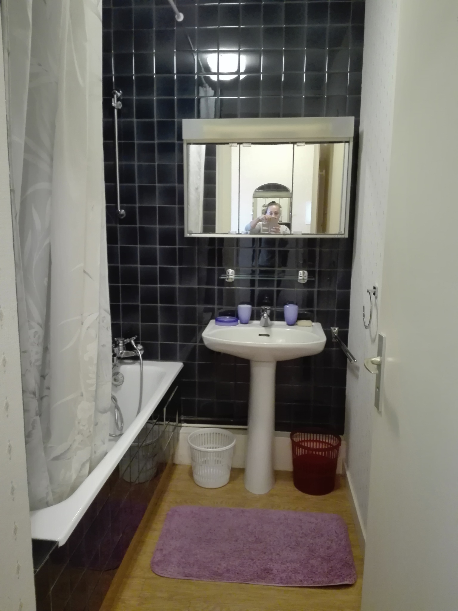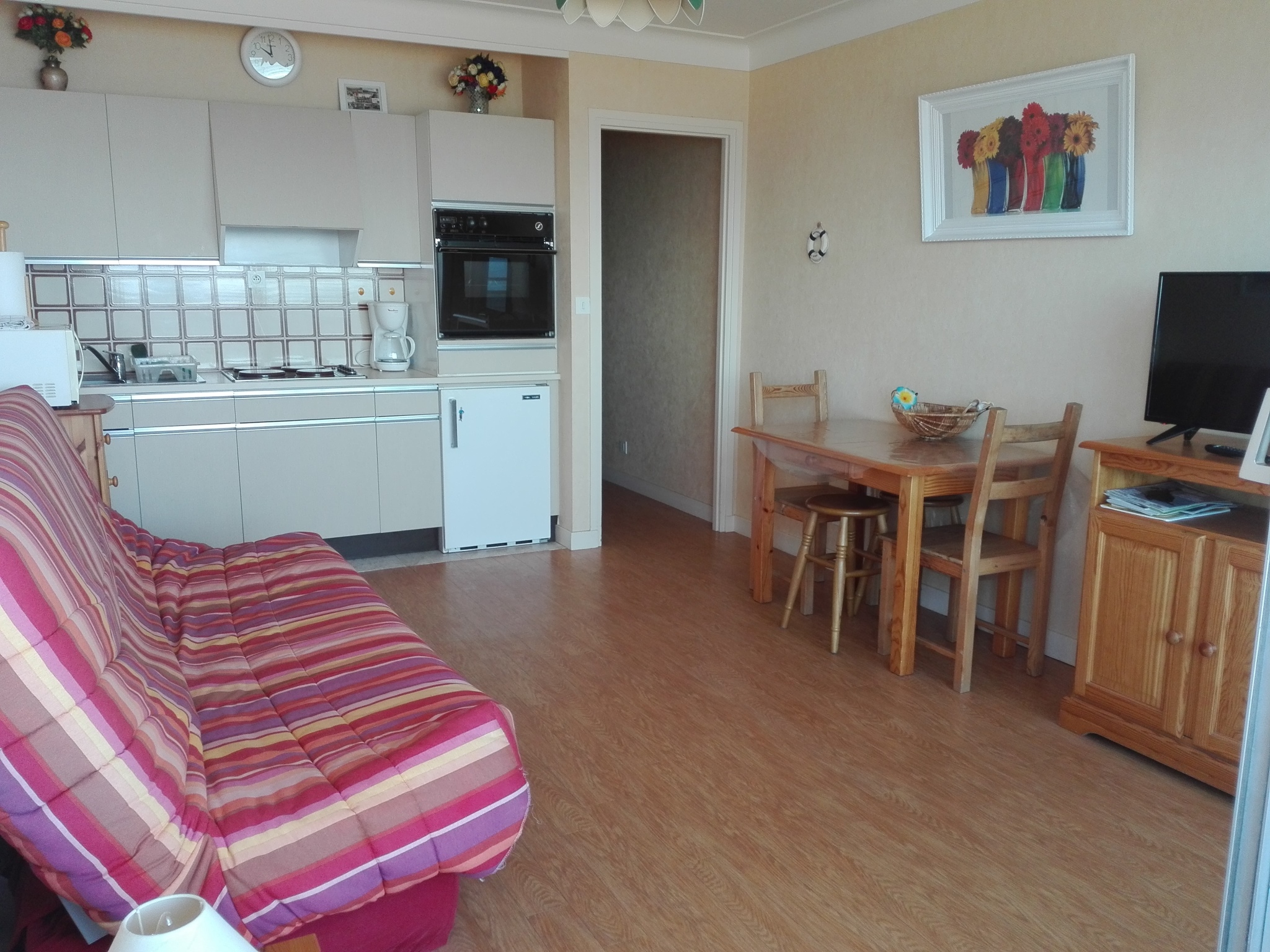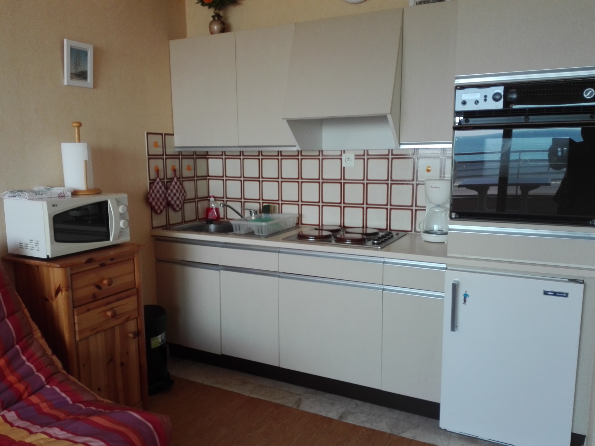 Studio,6e étage avec ascenseur, face mer, Promenade Clemenceau, proche centre ville et des parkings publics. Entrée avec placard, pièce principale (clic clac 2 personnes, TV avec connexion HDMI et USB), kitchenette (plaques électriques, four électrique, four micro onde, réfrigérateur top), balcon/terrasse (salon de jardin, 2 chaises longues), salle de bains (lavabo, baignoire), WC.
