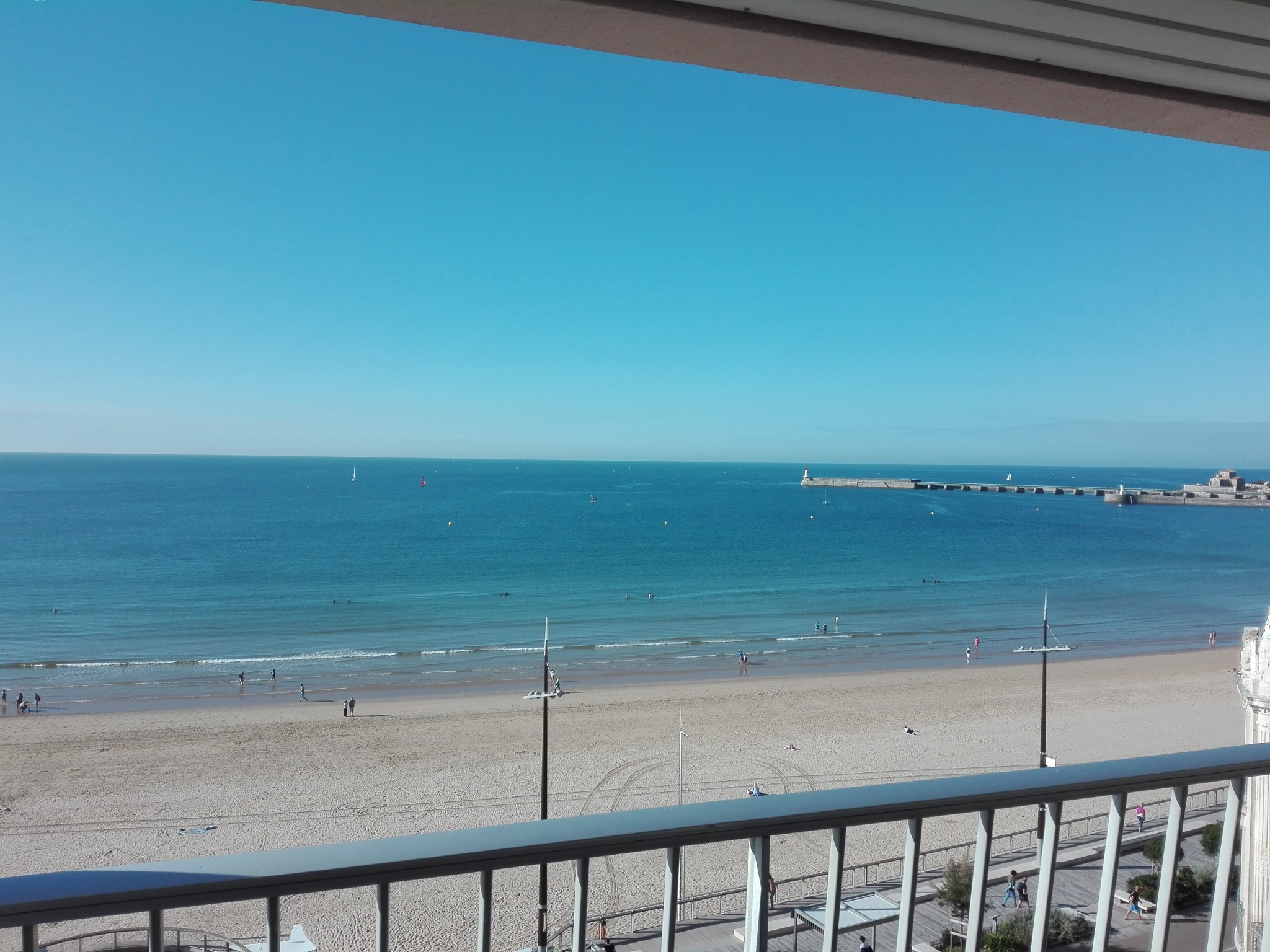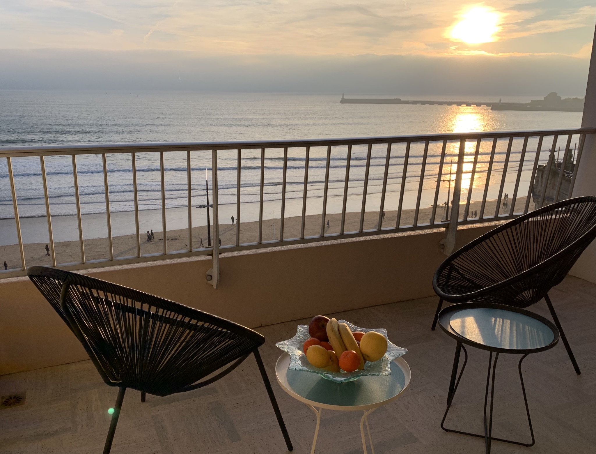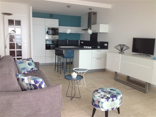 Face Mer, centre plage, très confortable studio rénové 30m2 env , 5e ét. avec ascenseur, terrasse 6m2 env, Local Vélos au RDC, Parkings publics et commerces à proximité. Entrée (interphone, placard) - Pièce principale face mer (canapé-lit 'Rapido' en 160, tv écran plat) sur terrasse (salon de jardin) - cuisine aménagée et équipée (réfrigérateur, plaques induction, four électrique, micro-ondes, hotte) - Salle de bains (Lavabo, baignoire, WC et lave-linge ).