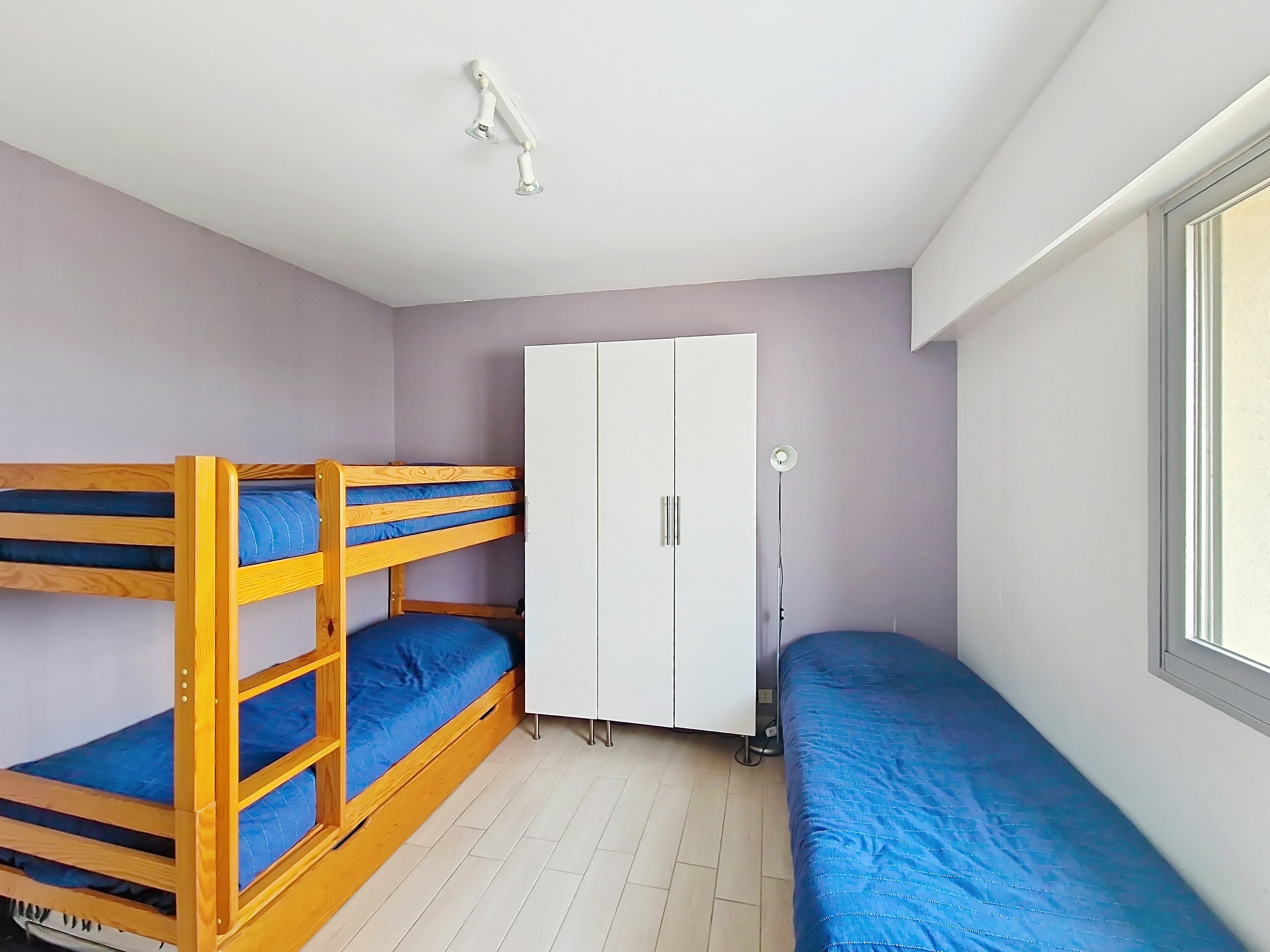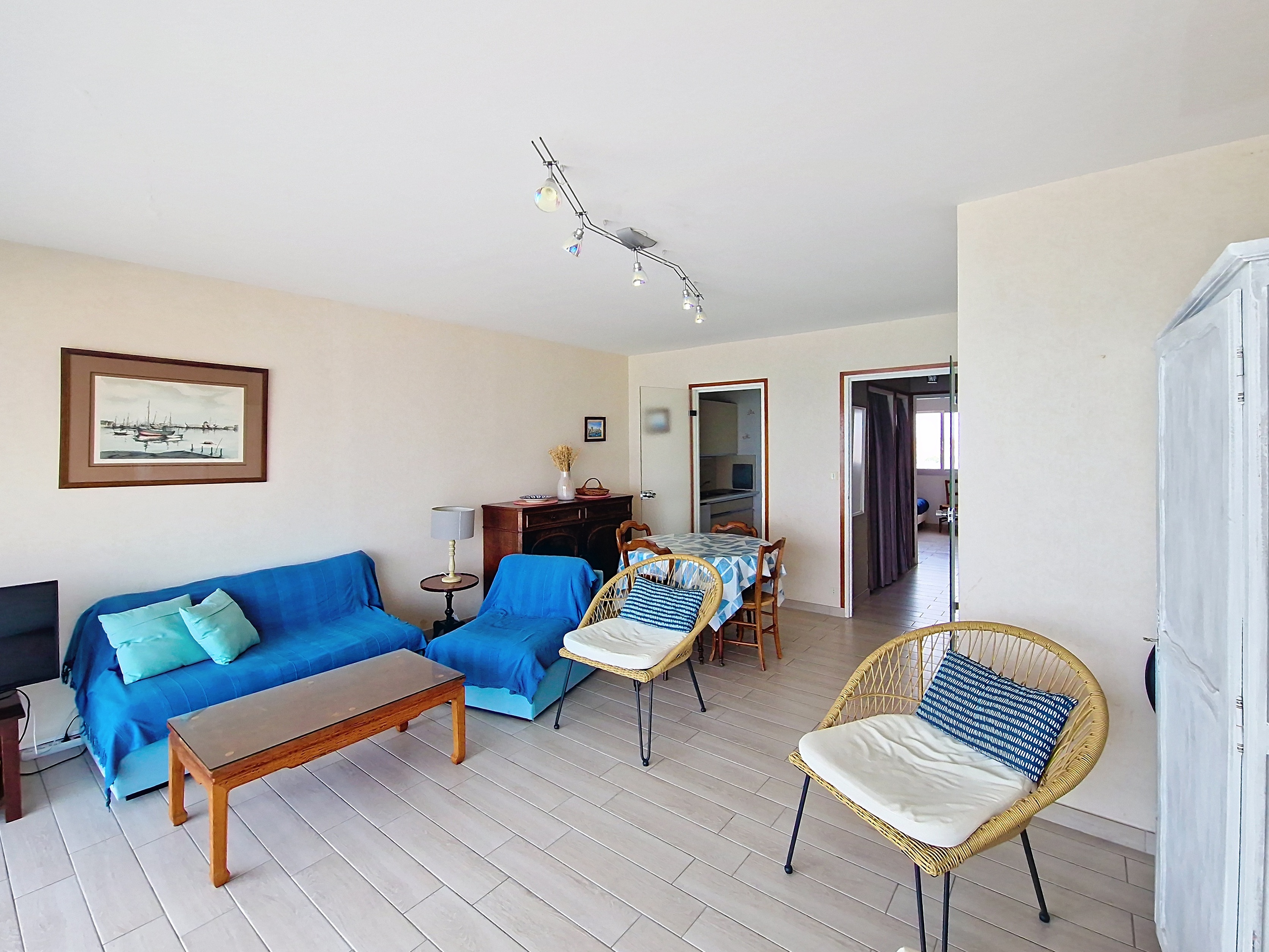 Séjour avec balcon - canapé lit 2 personnes - Télévision - Cuisinette : réfrigérateur-congélatur, 4 plaques, four, lave-vaisselle, lave-linge- Chambre : 1 lit de 90 + lit superposés de 90 - Salle de bains : baignoire, lavabo - WC séparé -
