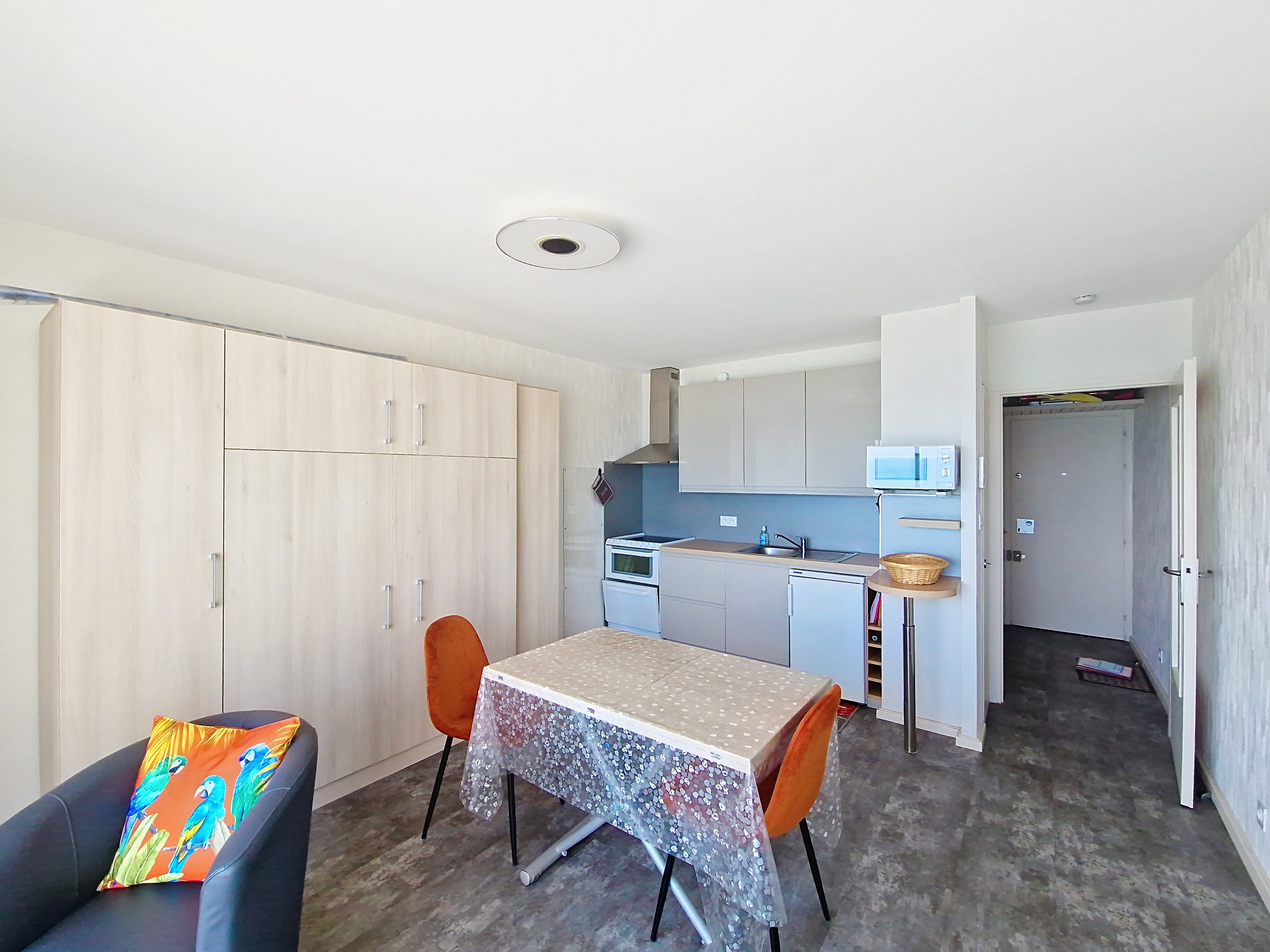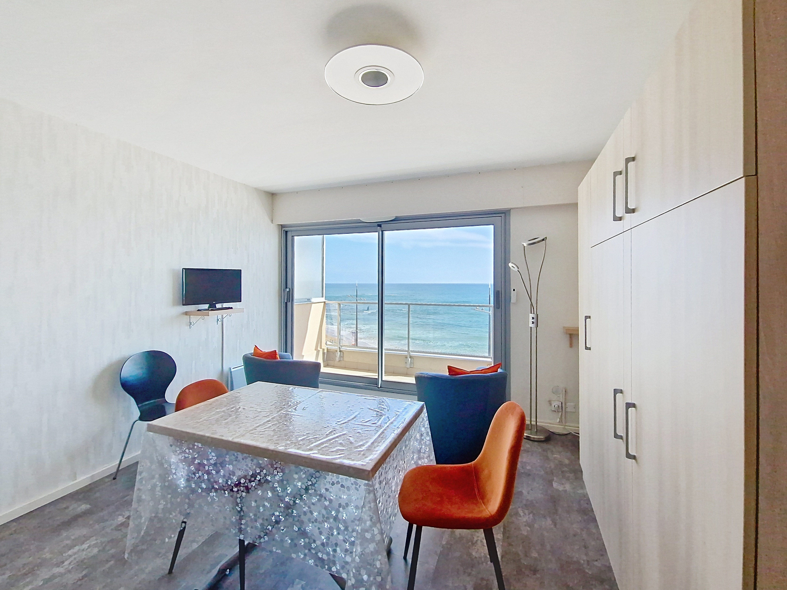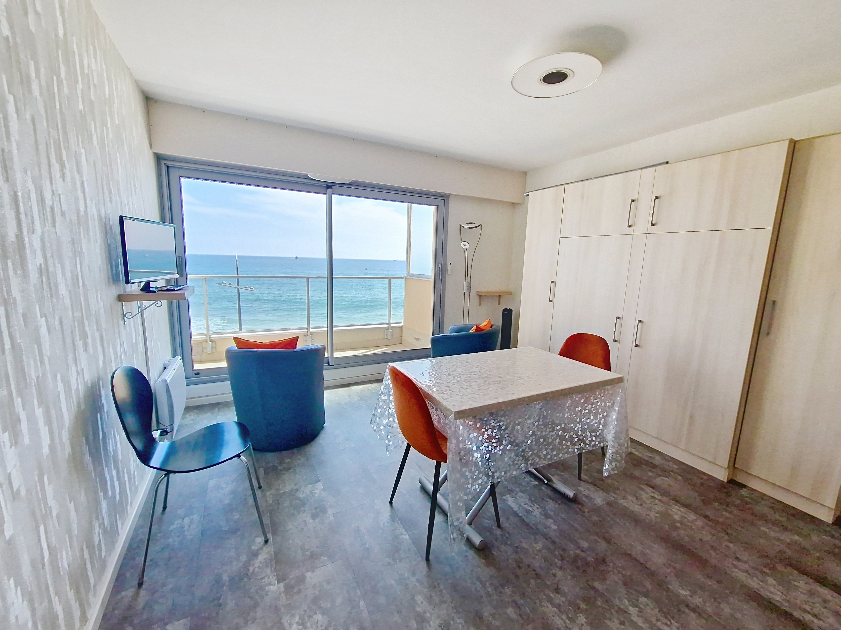 Proche Marché Arago - Très beau studio rénové face mer dans résidence avec ascenseur 4ème étage : séjour avec balcon (lit armoire 140, tv écran plat), coin kitchenette (plaque vitrocéramique, hotte, four compact, réfrigérateur top, micro-ondes, lave-vaisselle), salle de bains (baignoire, lavabo, wc).
