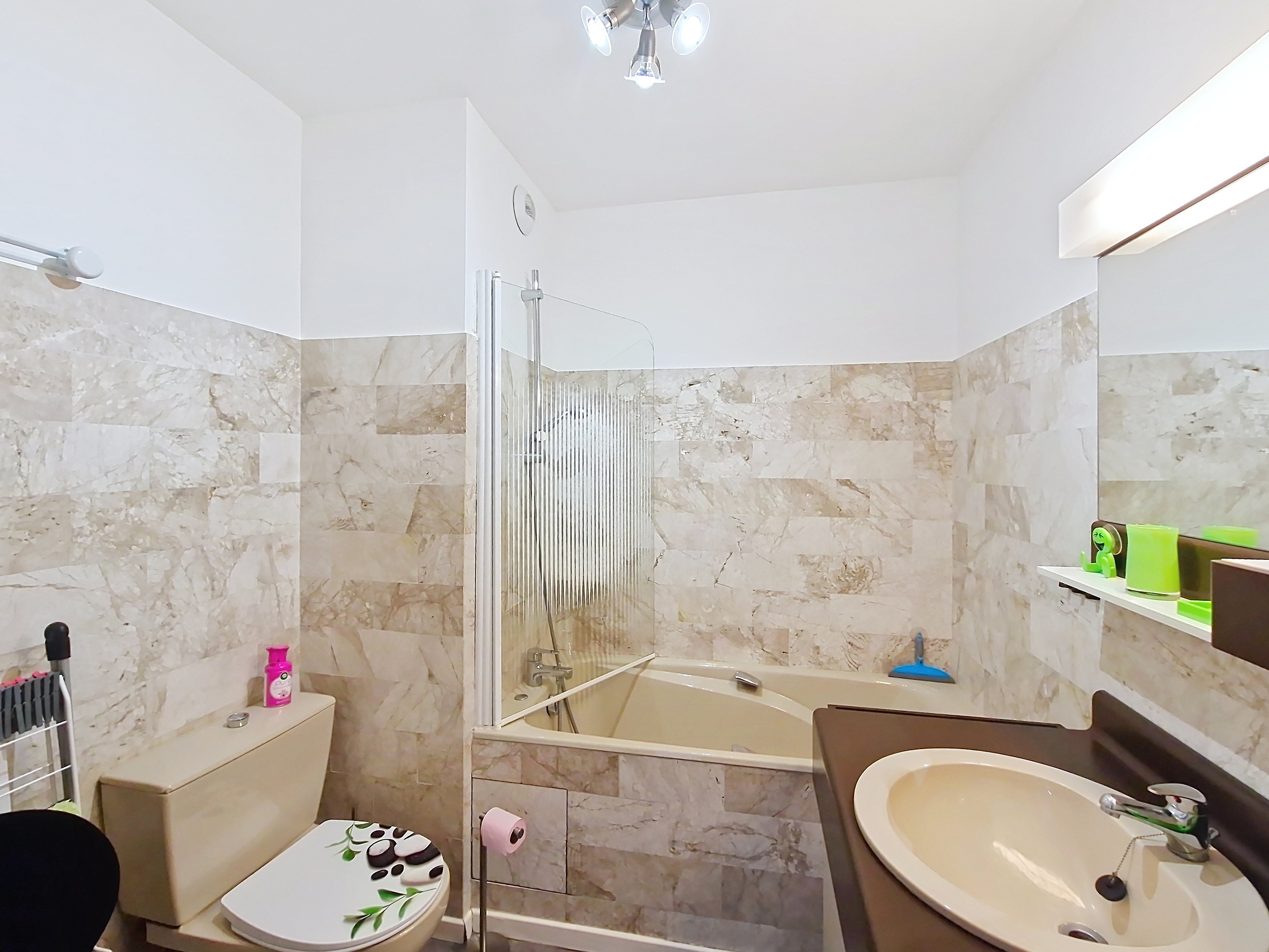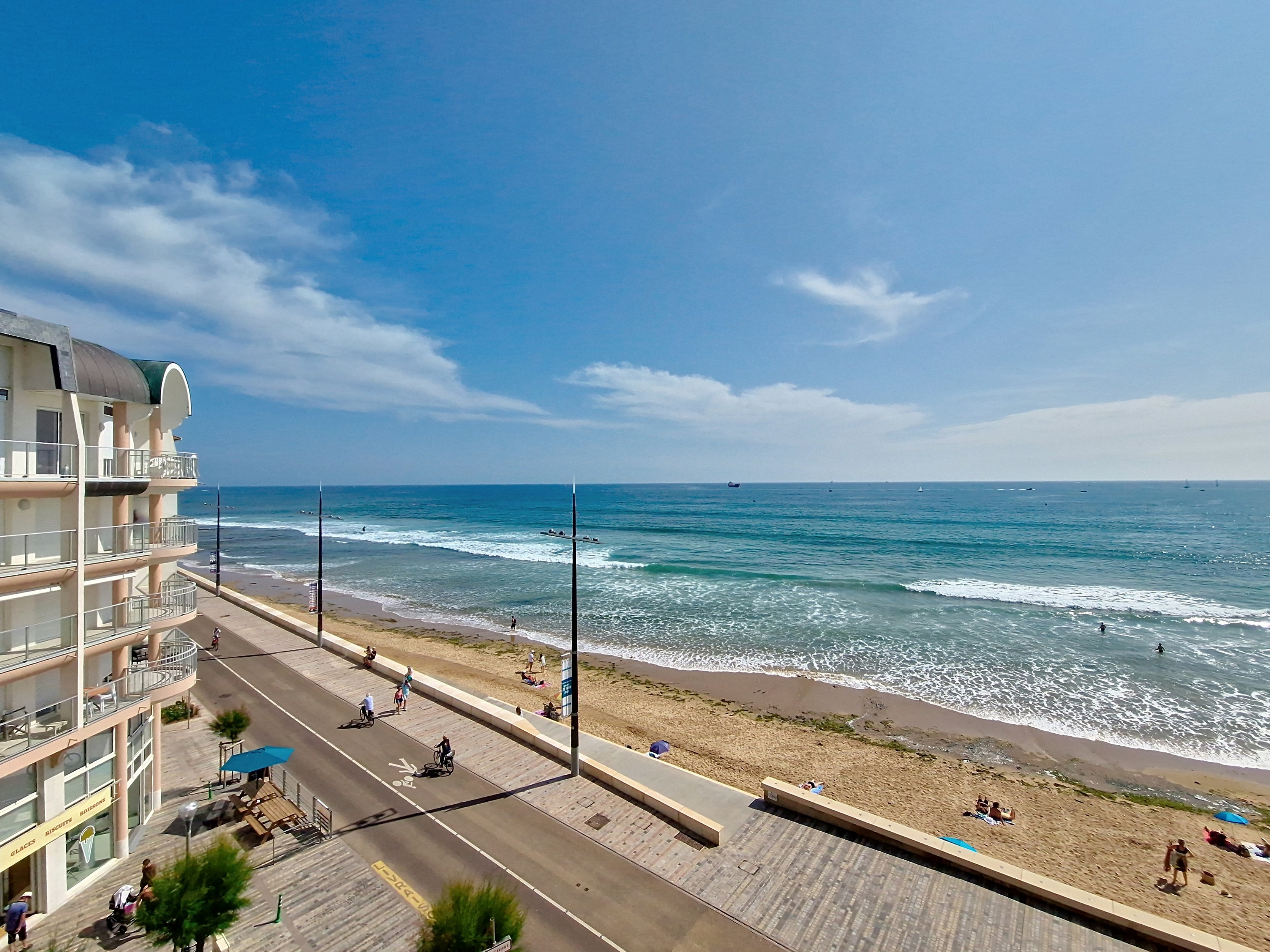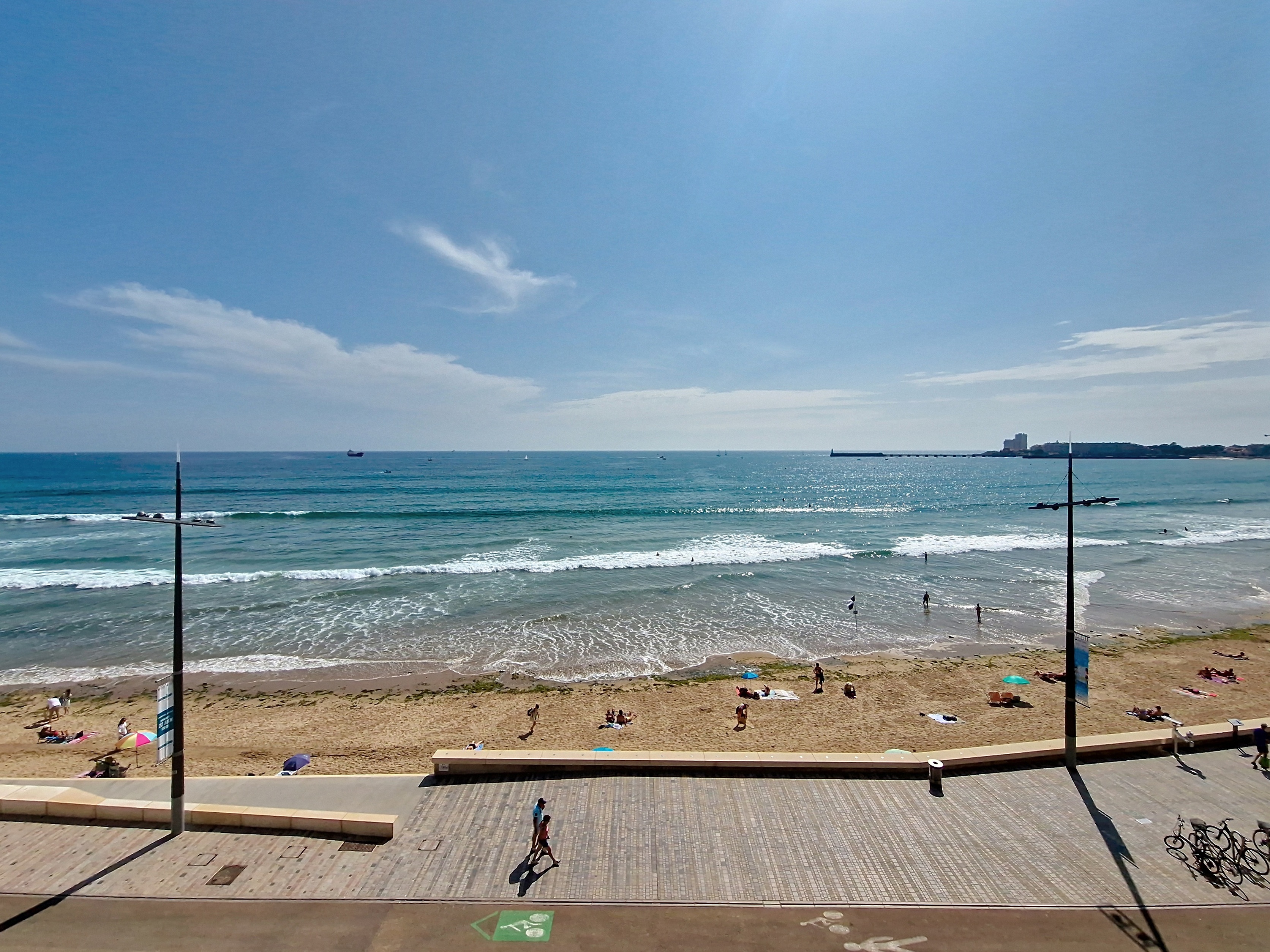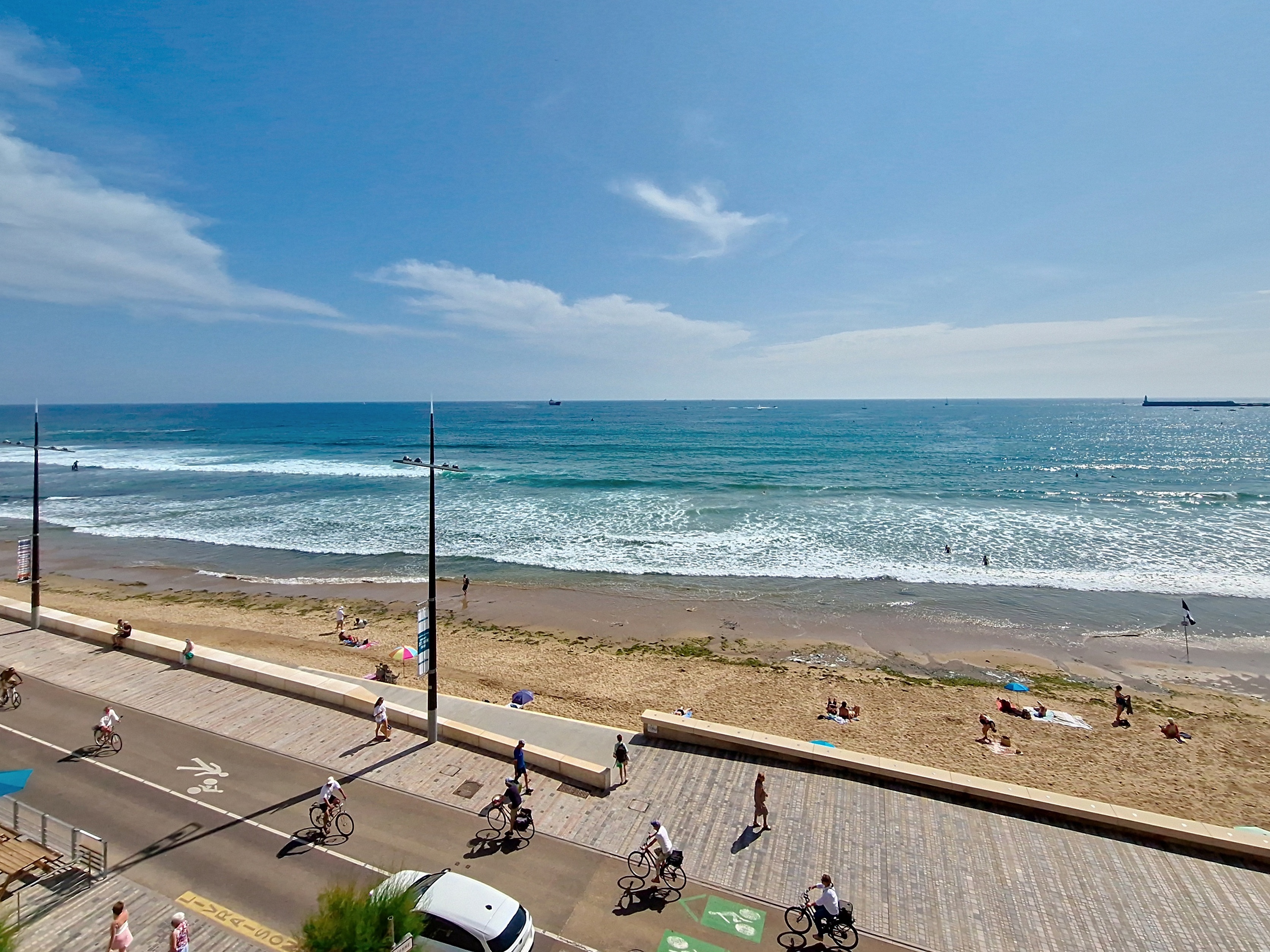 Proche Marché Arago - Très beau studio rénové face mer dans résidence avec ascenseur 4ème étage : séjour avec balcon (lit armoire 140, tv écran plat), coin kitchenette (plaque vitrocéramique, hotte, four compact, réfrigérateur top, micro-ondes, lave-vaisselle), salle de bains (baignoire, lavabo, wc).