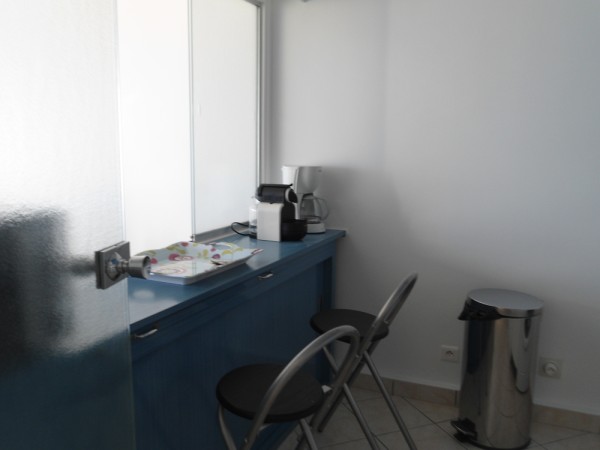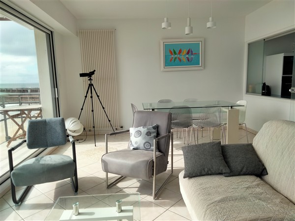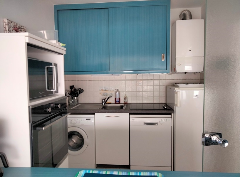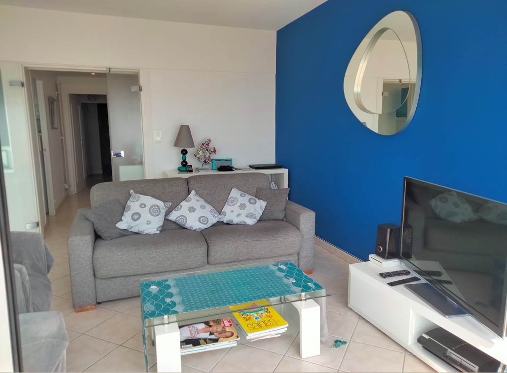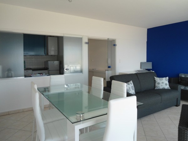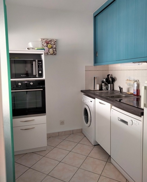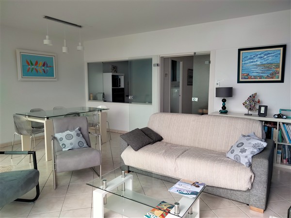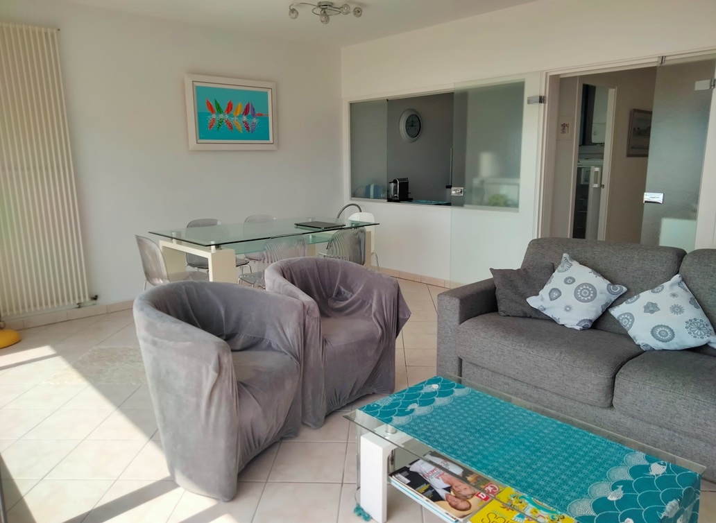 Entrée avec placard-penderie, séjour avec grand balcon vue mer, tv écran plat, cuisine aménagée et équipée : réfrigérateur/congélateur, plaques induction,four, four micro-ondes, lave-vaisselle, lave-linge.