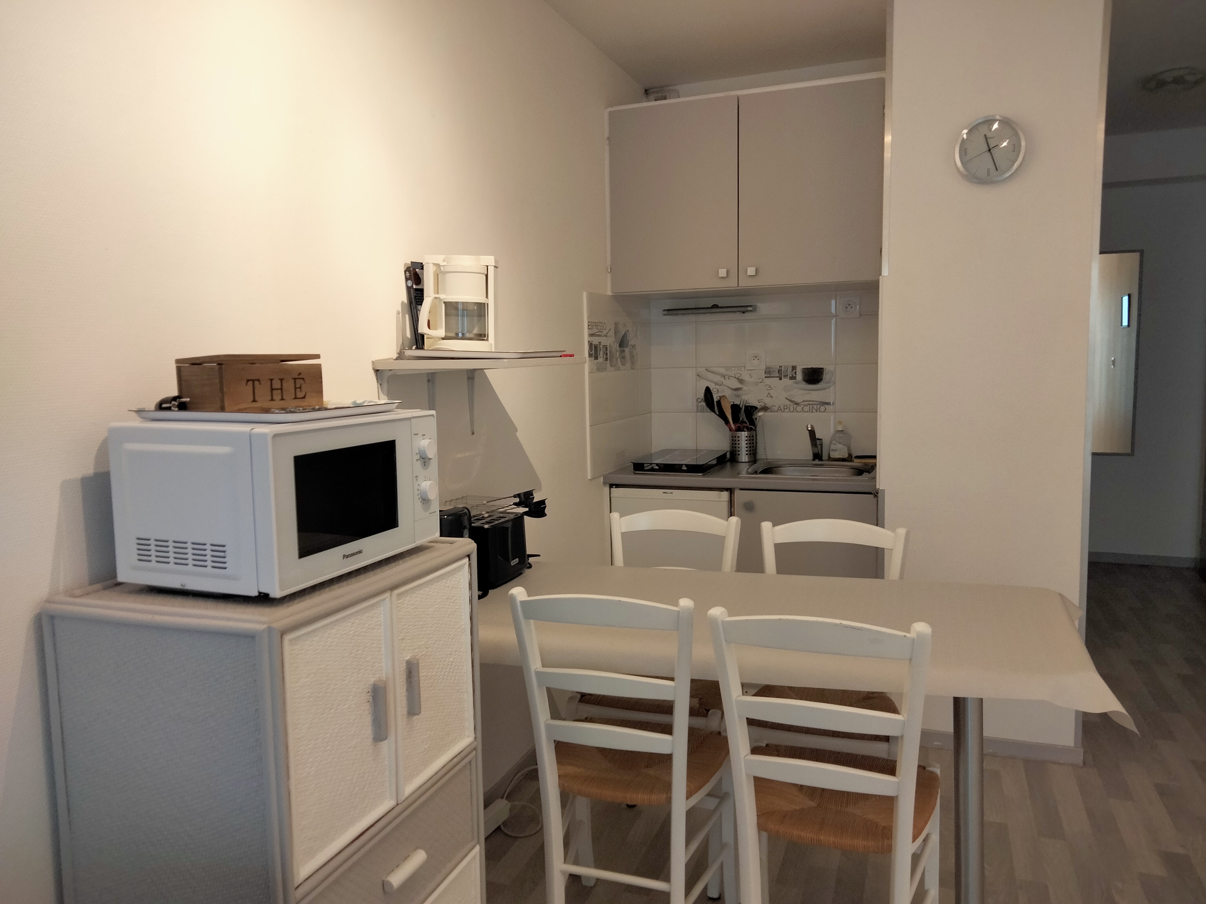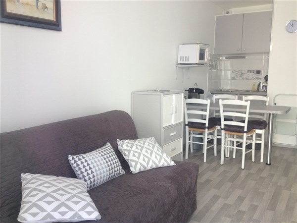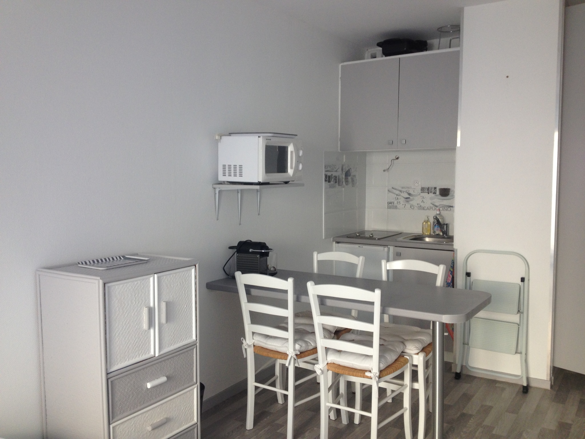 STUDIO à 100 m de la grande plage et 50 m du coeur de ville , au 2 ème étage d'une petite résidence avec ascenseur : entrée, placard/penderie, lit 140, écran plat,kitchenette avec plaques électriques, hotte, réfrigérateur top, micro-ondes, salle d'eau avec meuble lavabo, lave-linge, wc.